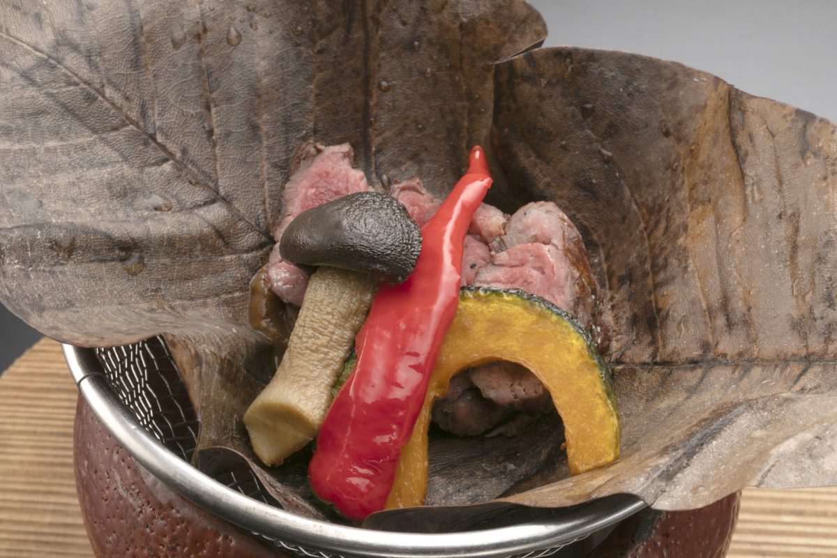 ◆ 宮崎産 有田牛ヒレ肉の朴葉焼き 秋野菜を添へて